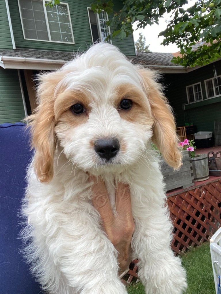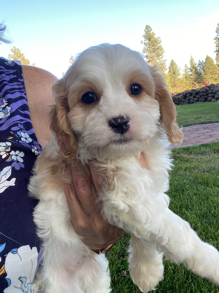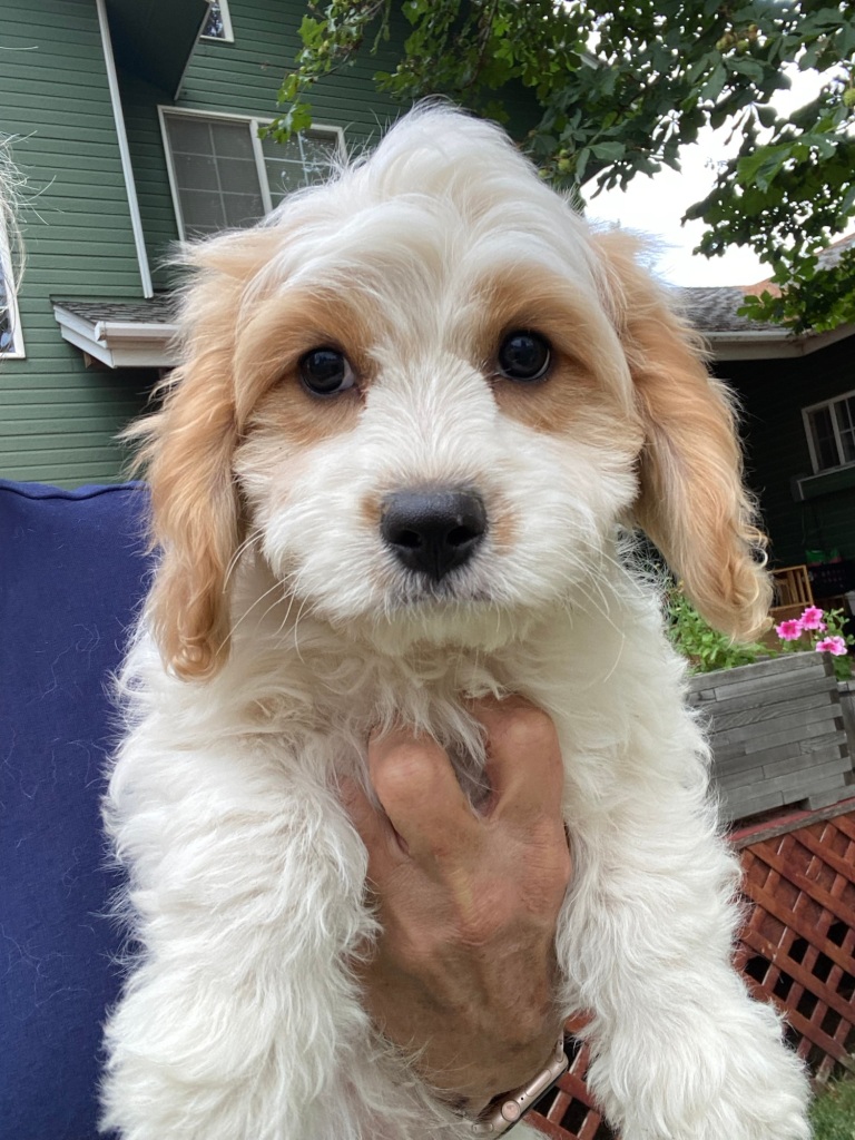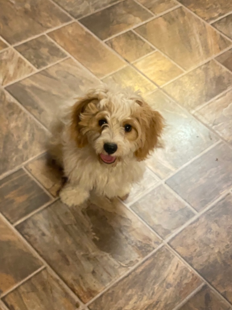 First, we have Buddy, the blenheim male Cavachon, accelerated puppy. He is taking daily walks on the leash and learning to use the doggie door and actively being crate trained. He is a lover boy and ready for his new home any day!