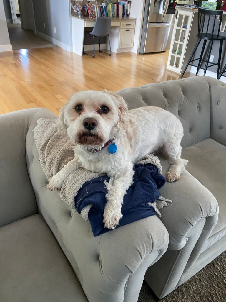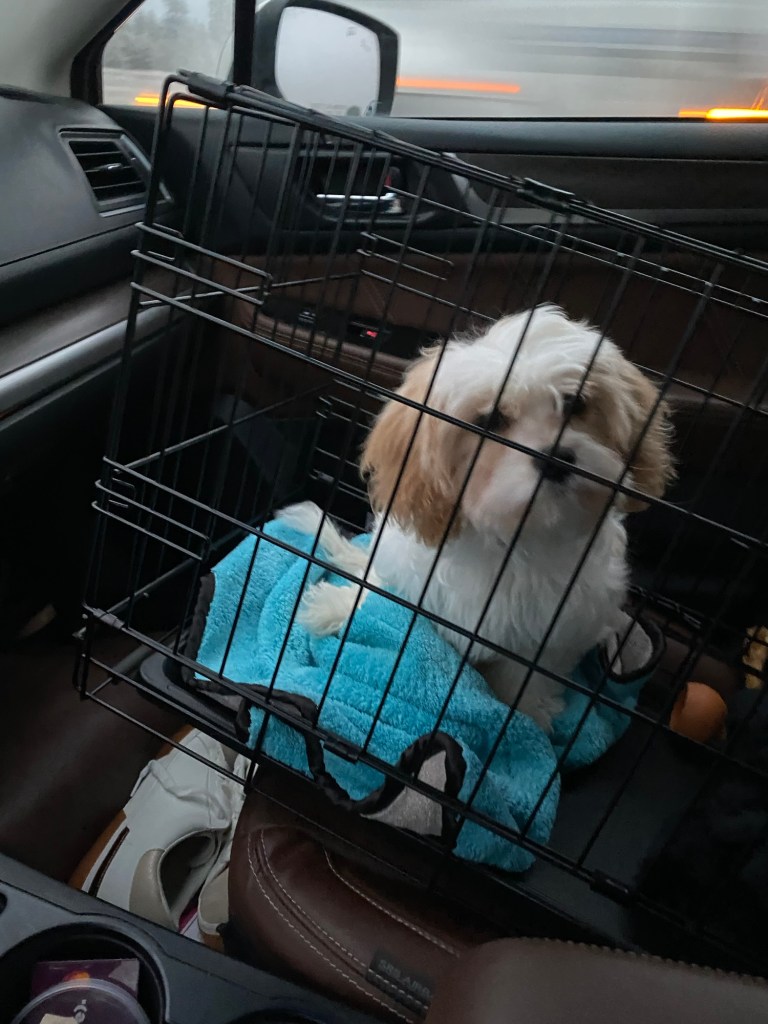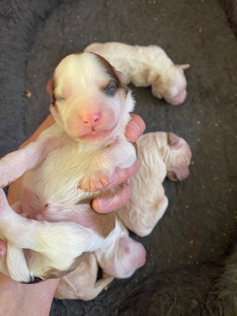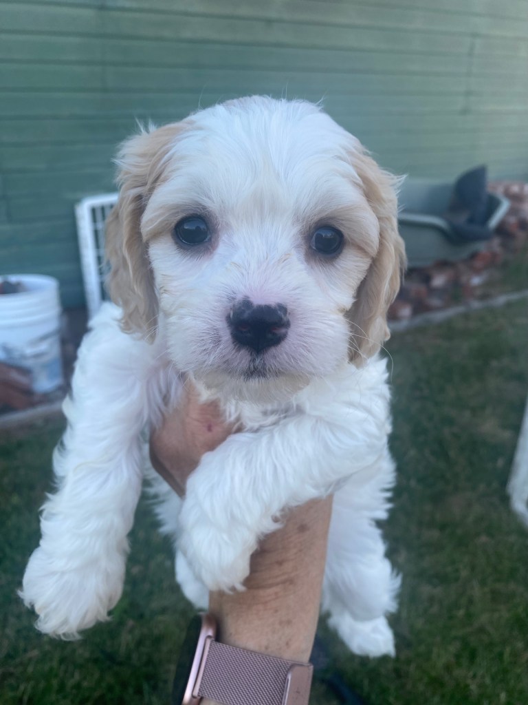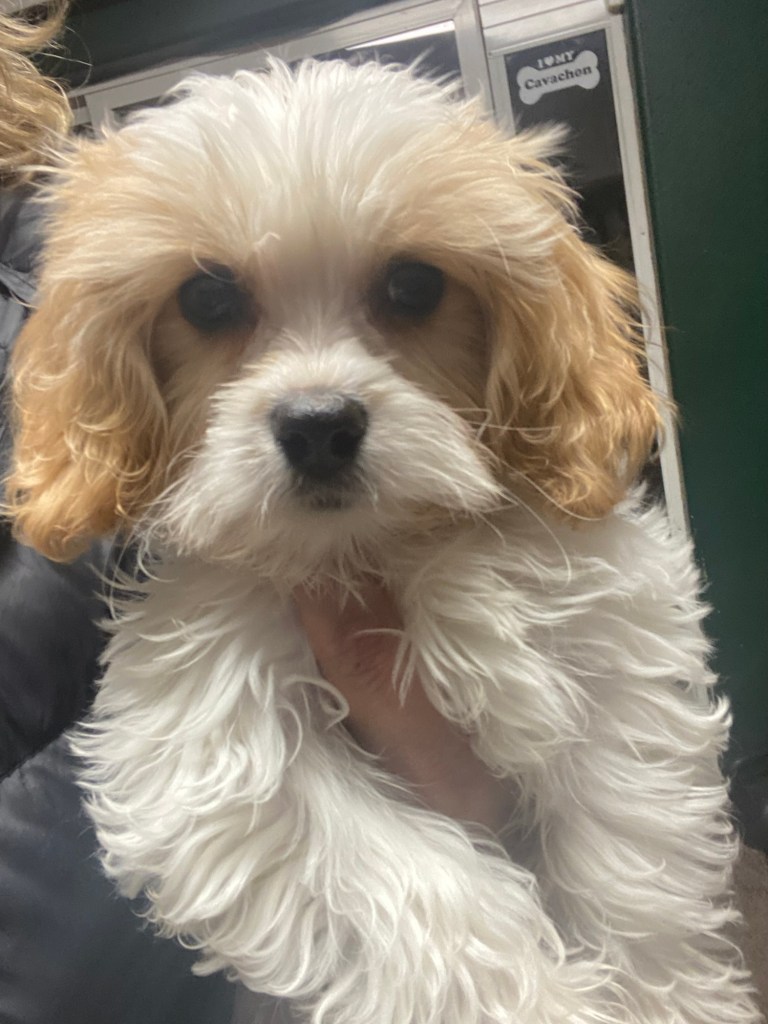 First, we have Buddy, the blenheim male Cavachon, accelerated puppy. He is taking daily walks on the leash and learning to use the doggie door and actively being crate trained. He is a lover boy and ready for his new home any day!