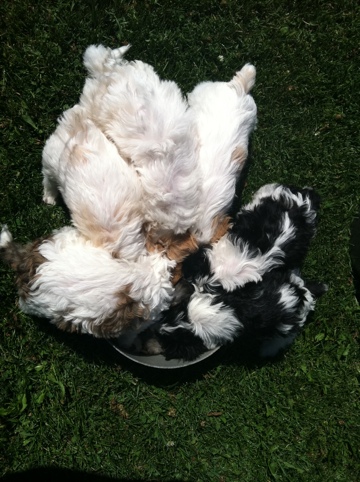 When puppies are 7 weeks old they ALL dive into the food dish at the same time!!