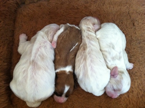 Introducing Molly & Teddy II’s litter born 9-23-11. There are 4 puppies, 1 Sable/White female, 2 Blenheim females, and 1 Blenheim male. We have 3 deposits for Cavachons at this time, so there is definitely at least 1 Blenheim female available from this litter. We are accepting deposits now.