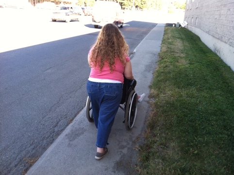I”m sorry this isn’t a better photo, but as we were taking a potty break, this gal passed us by, pushing another gal (my guess is that she had Downs Syndrome) in this wheelchair. They stopped and wanted to see Tiny Tim. I picked him up and the gal in the wheelchair could speak and pet him. Tiny Tim was not phased at all by her movements and it just struck me that he would probably be a great candidate for a therapy dog. I wish I would have gotten a picture of Tim with the gal, but it all happened so fast, and before I knew it, they were heading on their way.