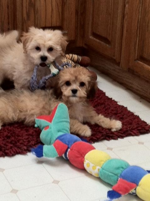 Golden Shichon and Solid Sable Cavachon playing in the kitchen.
