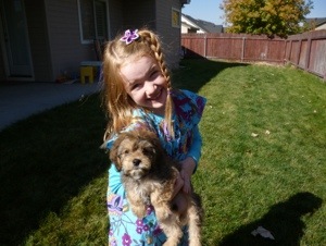 Just wanted to send you a couple recent pictures of Ashley who we are calling Tucker. He is watching a soccer game in one and modeling a costume the kids had to get him in the other! He was about 9 1/2 pounds 2 weeks ago and he was 4 months yesterday. He is a great dog – sweet and full of energy. He is great at tagging along to kids practices and games and anywhere else we take him. He loves the car and is always a huge hit with everyone who sees him. He loves dogs – especially big ones. He just had a little clean and tidy (face trim, sanitary clip, etc.). His coloring is still quite golden and he actually has “stripe” down the middle of his back that is darker than it was when we got him – closer to his ear coloring.