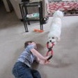 Just an update on our cute Sophie who we have had for a year now. She is 20 lbs and holding and full of energy and fun. I don’t think she has met a dog or a child that she doesn’t like although some of the older dogs might not be so keen on her playfulness. She is a chewer, however, so we keep the Kong and Nylabone people in business. It is amazing how good she is with our grandsons and they love her too (as you can see in the photos) except when she eats their Legos. I would recommend a Cavachon to anyone who is looking for a sweet tempered pet. I can’t count the number of complements I get on her wherever we go. ”