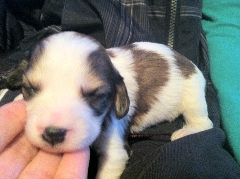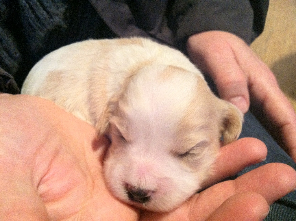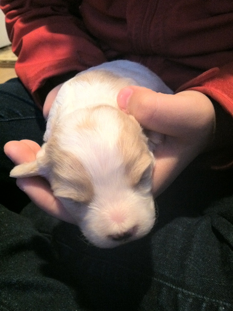 This was the tiny, tiny female from Lilly’s litter. She shipped all the way to North Carolina and did fine on the plane! She will probably stay under 10 lbs as an adult, which is a lot smaller than our normal 13-19 lb dogs that our Cavachons generally grow into. Can’t wait to hear how she progresses in size!