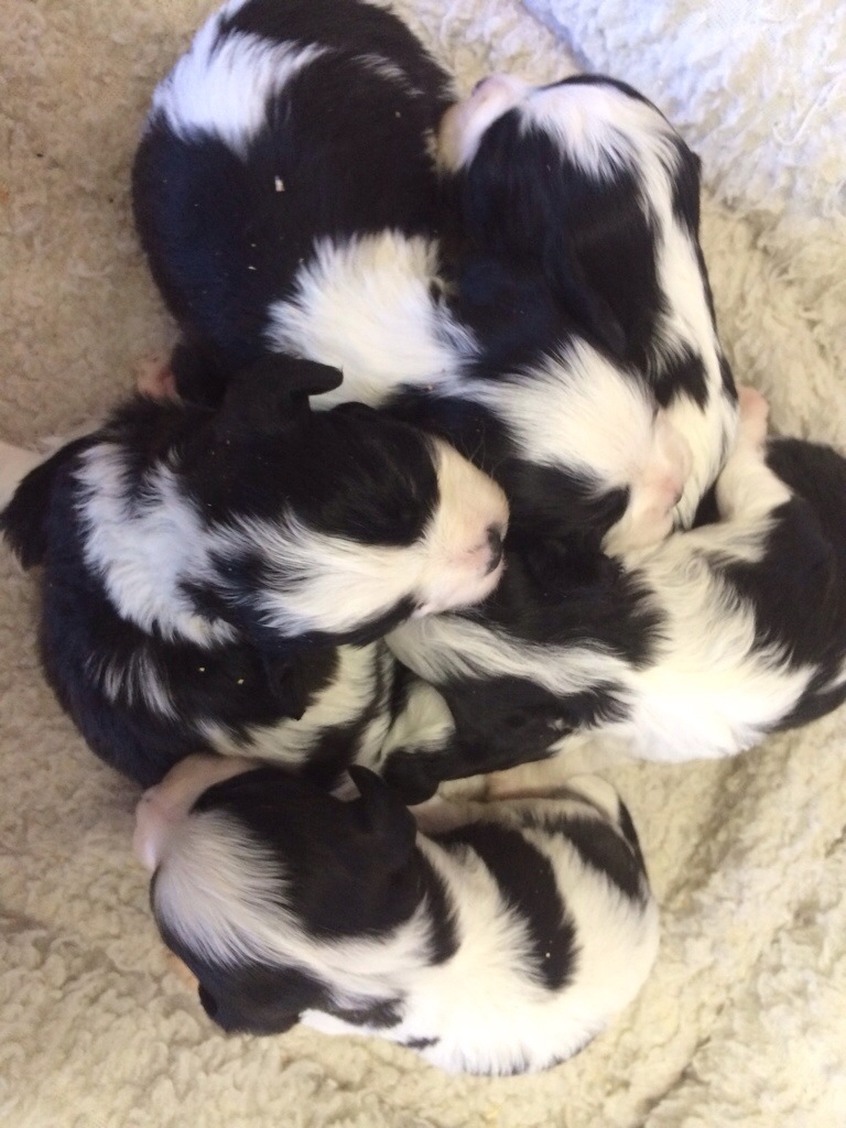 Sadie’s black/white pups. 2 girls, 3 boys.
