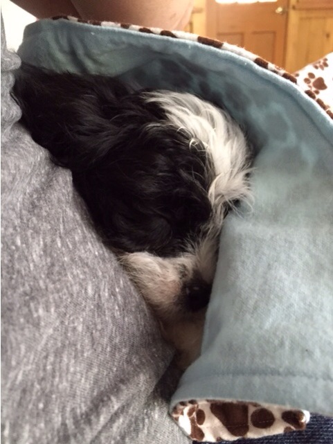 Woody (that’s the name we’ve chosen) got here fine and is acclimating to his new home. He was exhausted after the travel and slept in my lap for more than an hour after I got him home. Below are a couple of pictures of him…one sleeping on my lap after I bathed him (he got a little stinky during the flight) and one with the girls and a friend. Our girls are on the left. They were so surprised and won’t stop buzzing for a few days I think!!