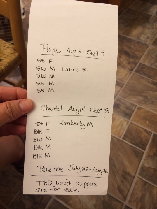 Red star means interest in the Paige pups, “X” means pass on this litter. “Fall” or “2016” means pass on this litter. “F” means they want a girl puppy and since we only have potentially available males left, that is a pass as well.