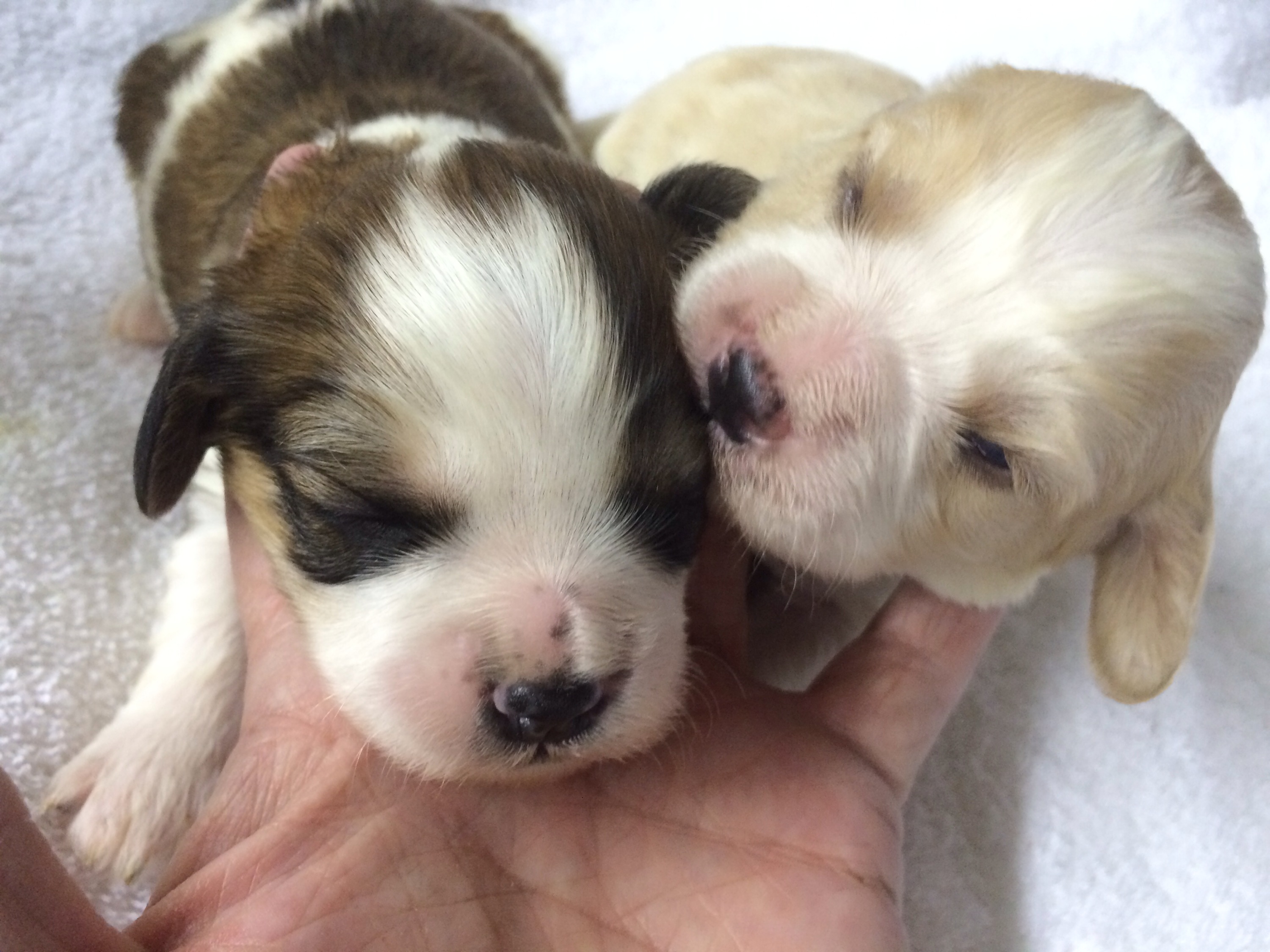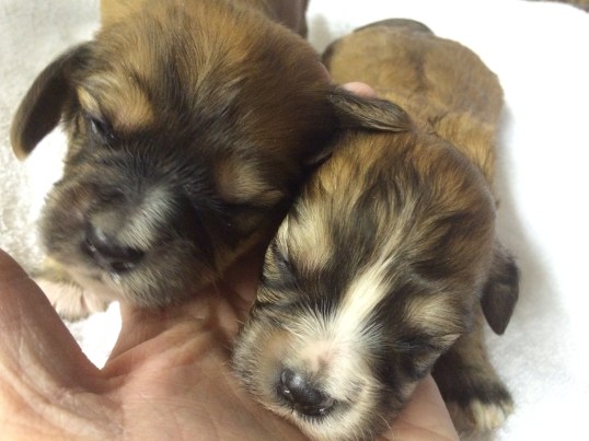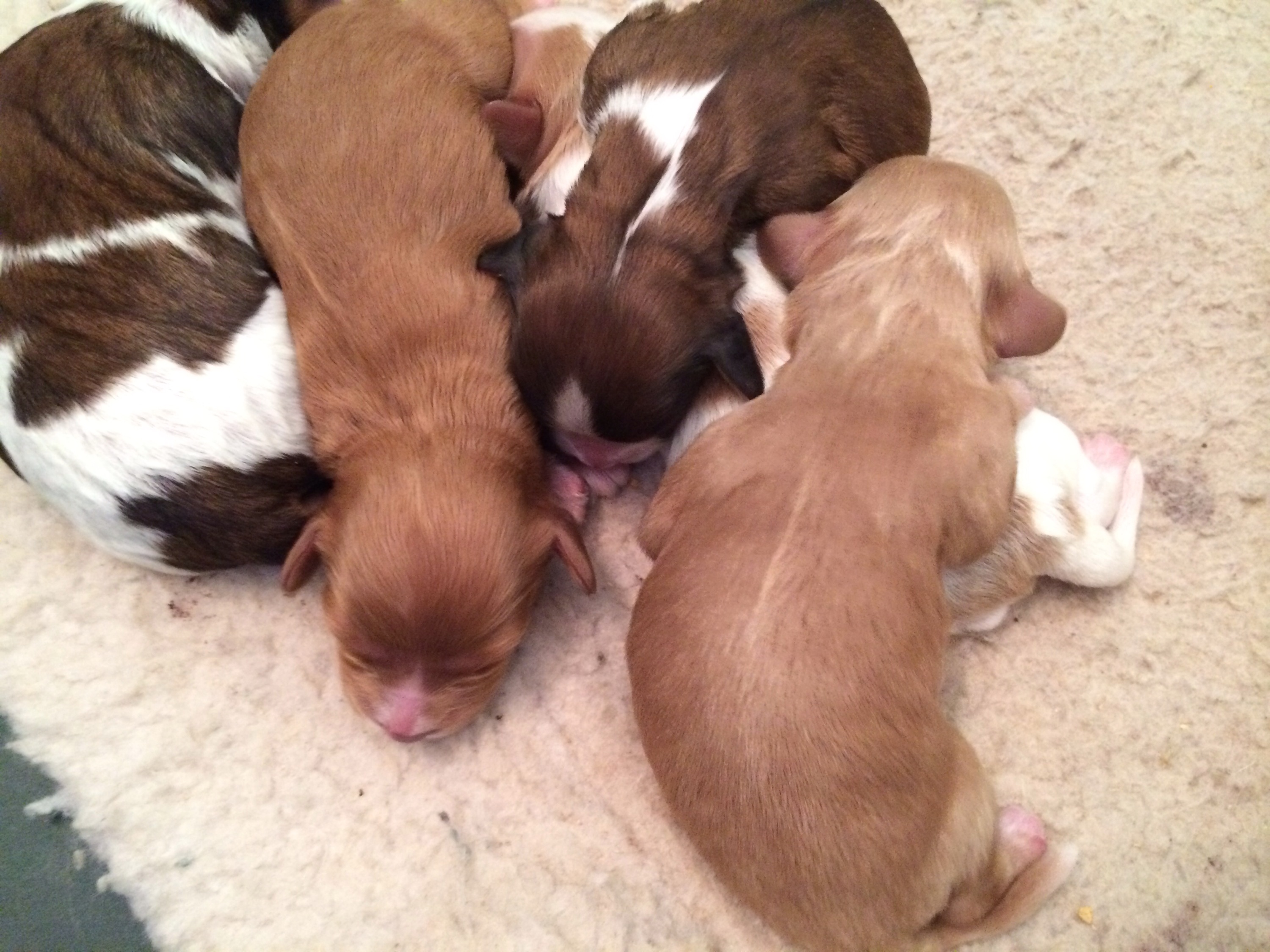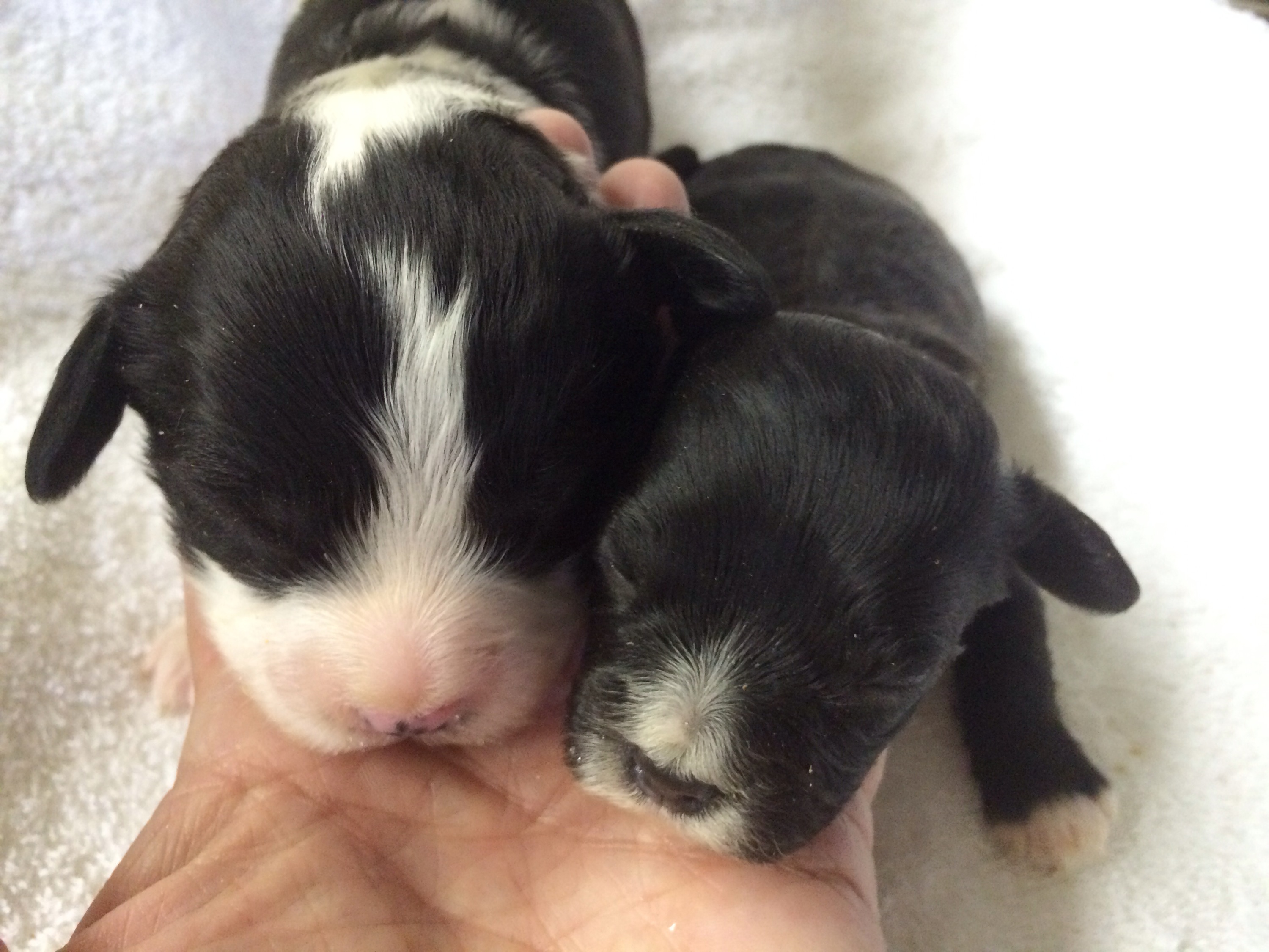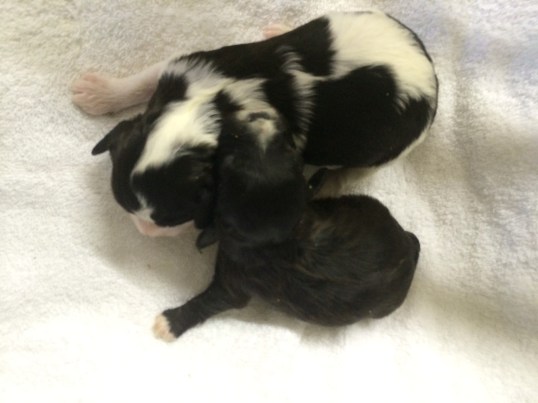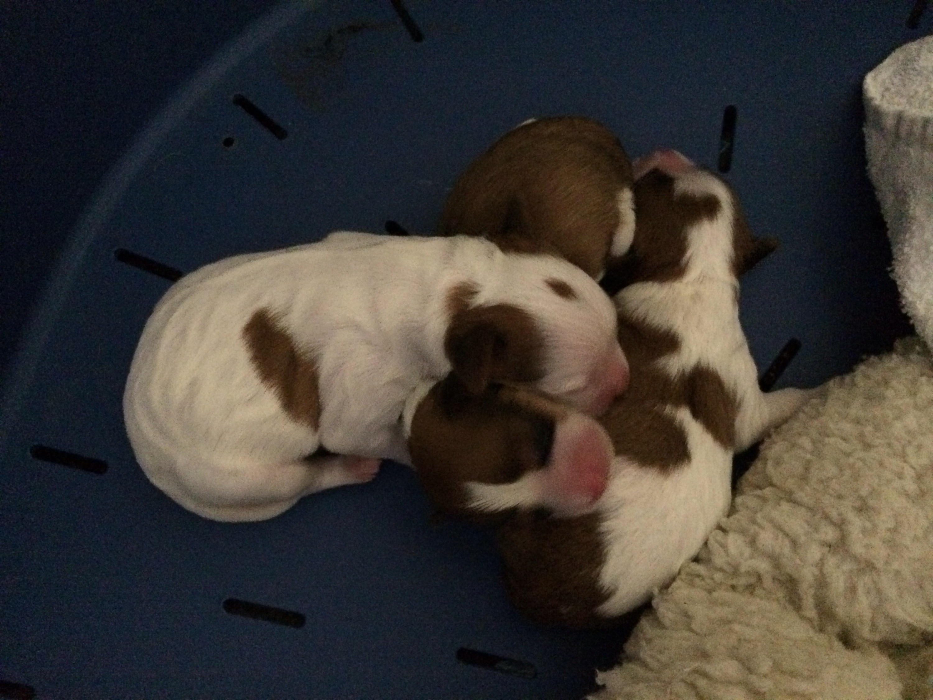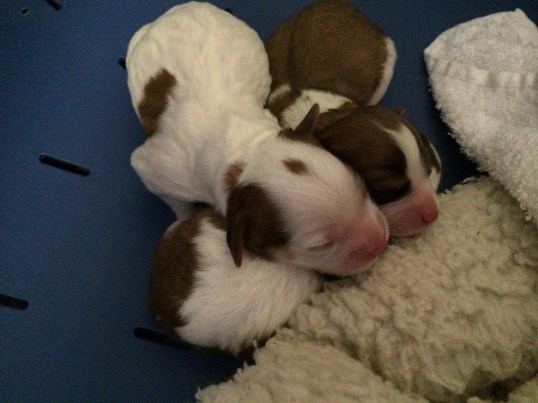 5:30 pm…get home and settle mom and babies into 1/2 bath with space heater and cozy whelping bed. Marvel at how beautiful the babies are, check genders, and feel very thankful for modern medicine that saves lives.