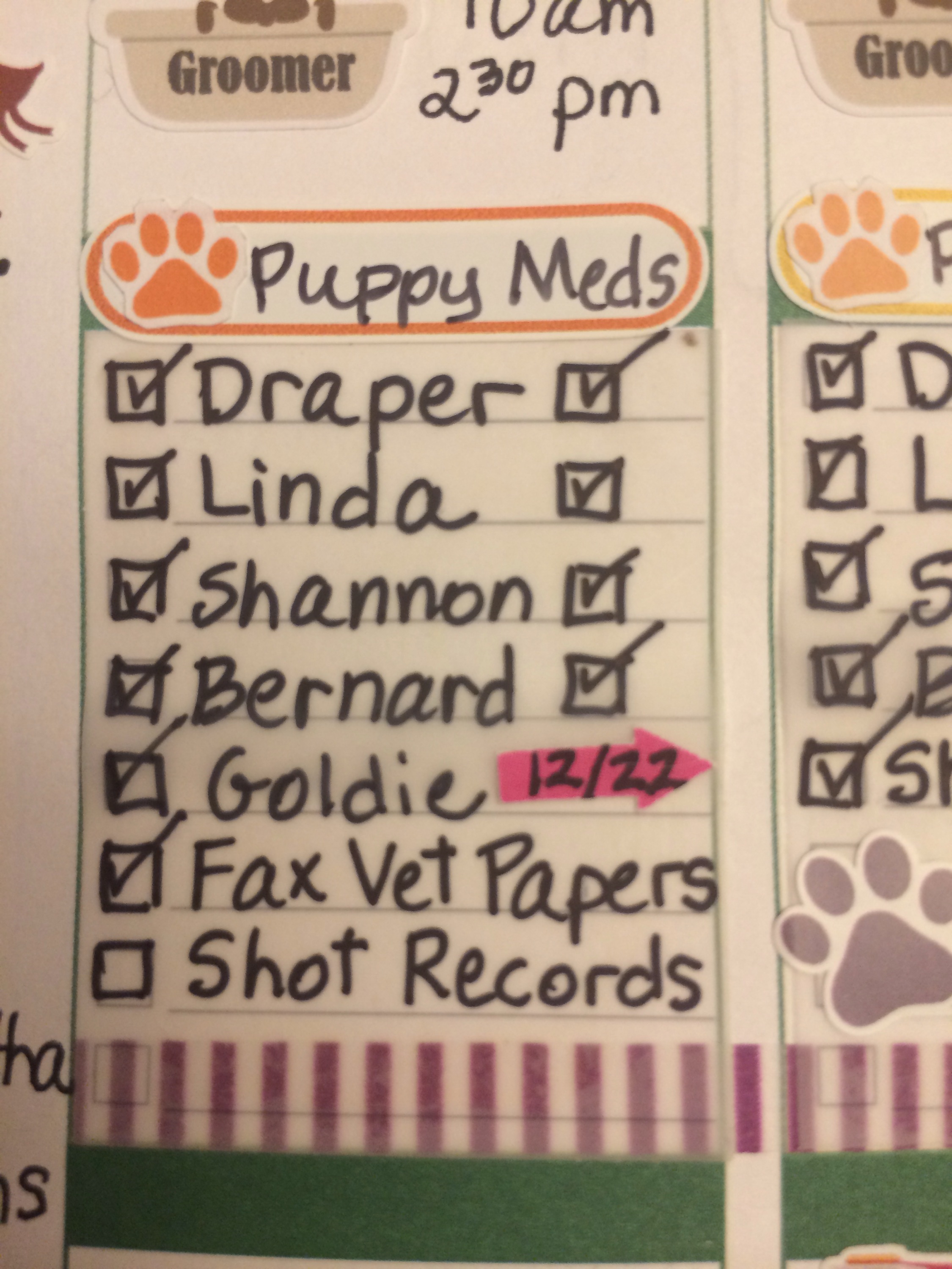 But we did not get good news at the vet visit. While the remaining puppies in the litter did not show any symptoms at all, it was found that their lymph nodes were just beginning to swell. This is the first symptom of Puppy Strangles, so they were not allowed to fly, and all three of them were also put on the aggressive treatment plan for this condition. More phone calls had to be made and this was a very low time that hit us hard over the Christmas holidays. Here is my planner keeping track of all the meds during the peak of having 5 puppies under treatment, multiple vet visits, and everything else that was happening with the dogs–plus it was Christmas week!!!