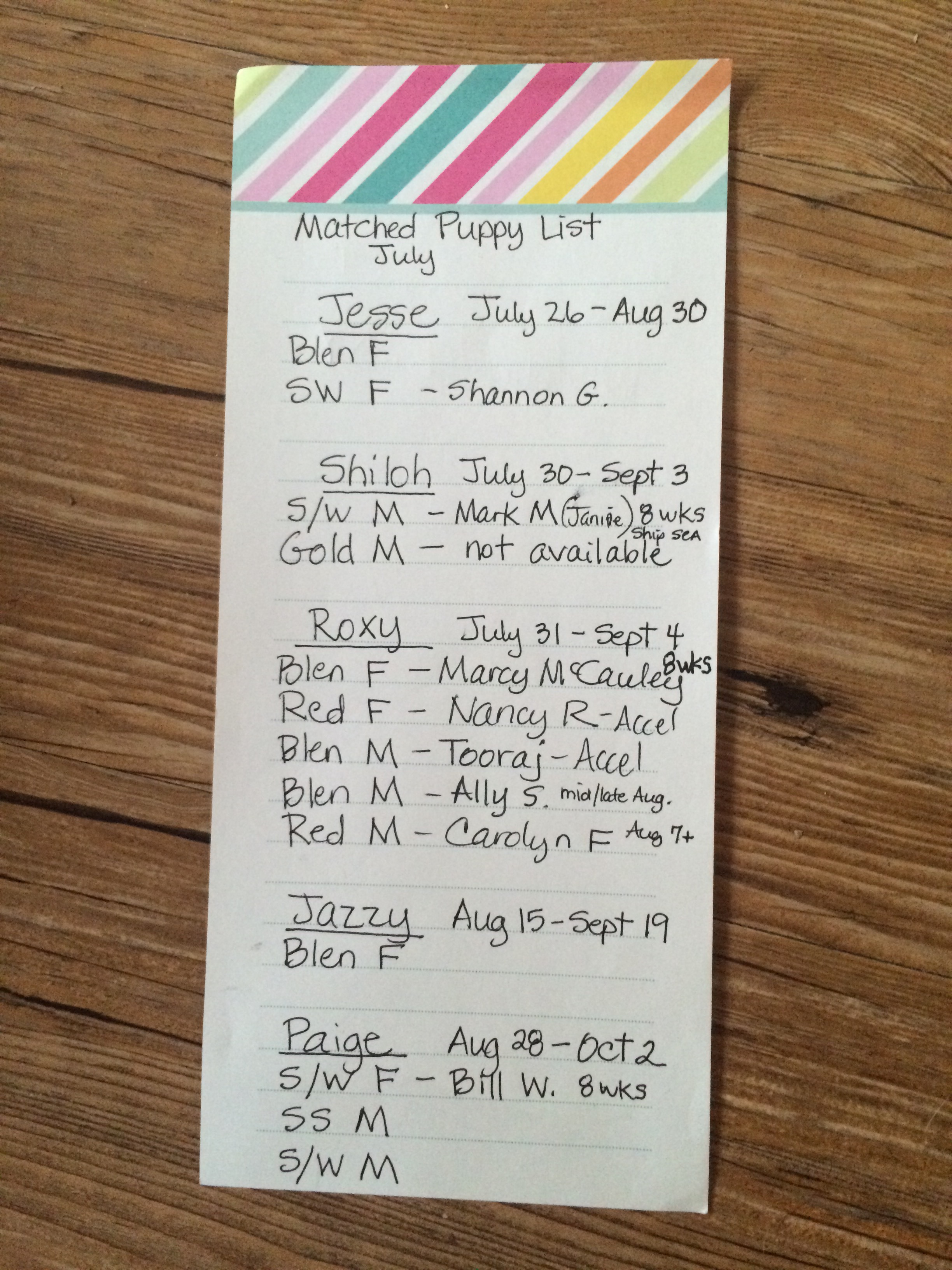If there are no notes next to your name, it is crucial that I hear from you ASAP. I have already removed a few names off the top of the list because I have received no communication in MONTHS, or they have decided on a different path for a puppy. .