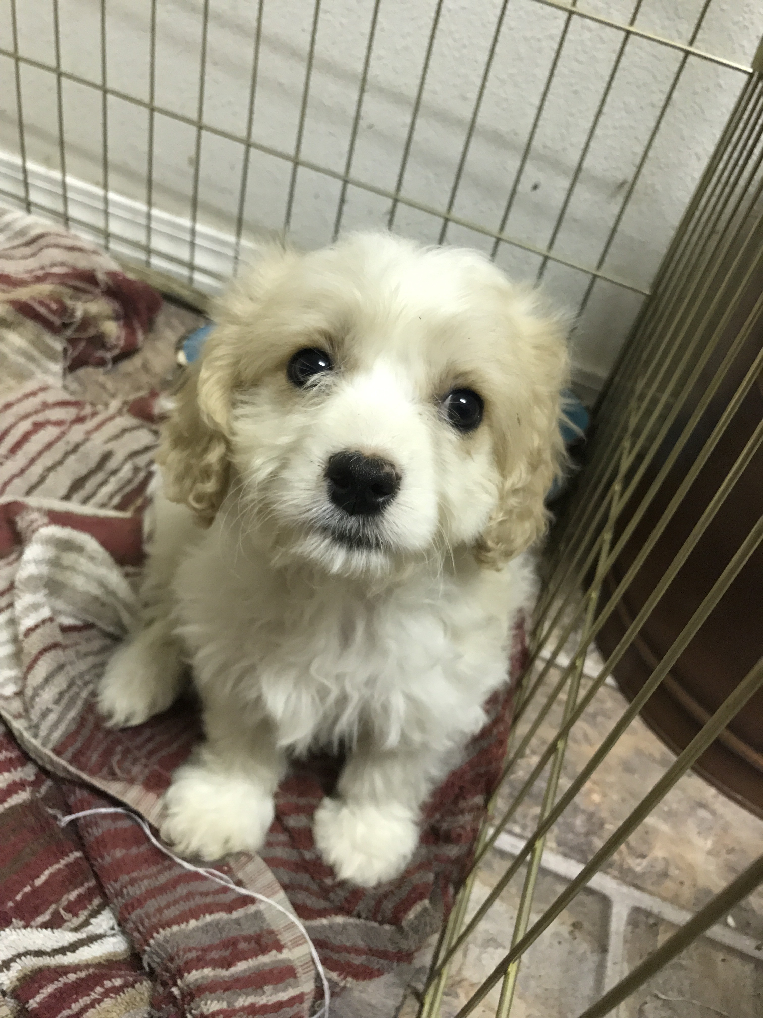 He is very playful and happy. He’s eager to explore and then ready to snuggle when he’s tuckered out. He should grow to be from 15-20 lbs as an adult. He has soft apricot coloring on his ears and a bit on his back. He has a nice wavy and thick coat and will be a typical shaggy looking Cavachon.