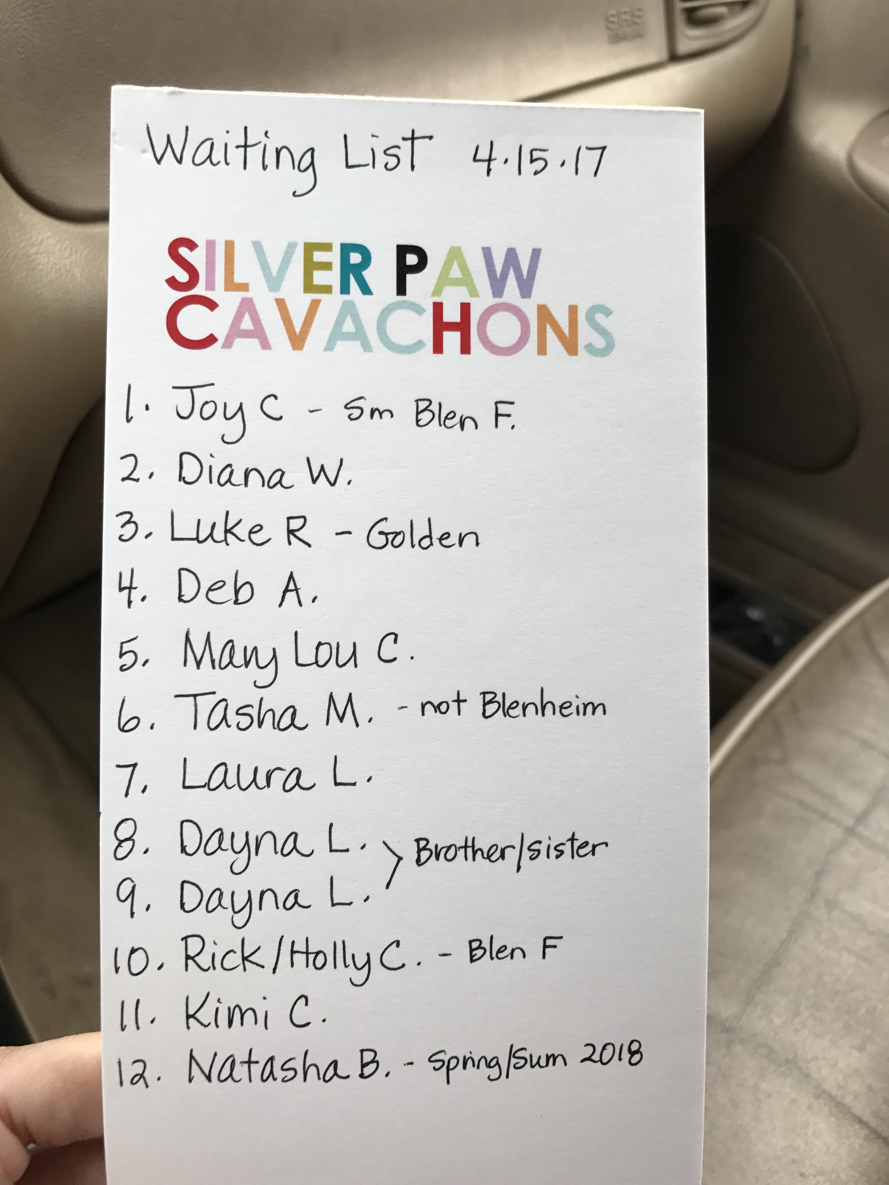 These babies will go home in mid June (June 16th).  I need to hear from everyone on the waiting list to know if this timeframe works into your timeline. That is the first decision. We can discuss color and gender later.