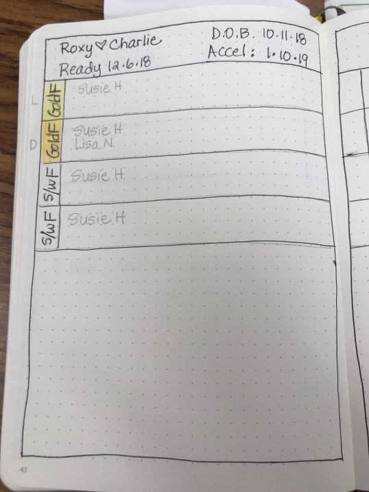 Colors correspond to collar colors on the puppies.