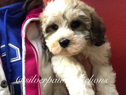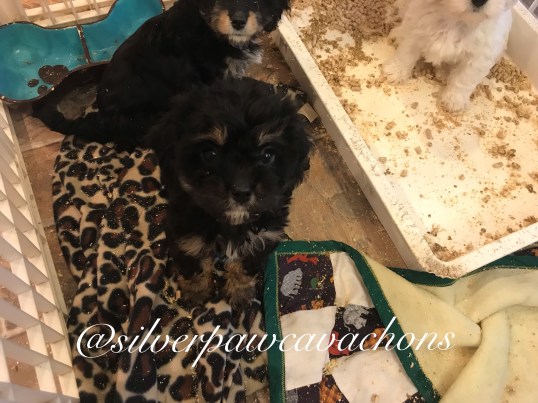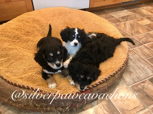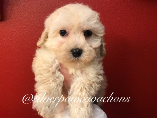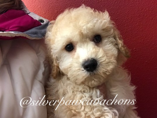 Here are the newest pictures of the Roxy pups. These pups are F1b, which means they have a Bichon mom, and a Cavachon dad. Essentially, they are 3/4 Bichon and 1/4 Cavalier which simply translates into a curlier coat! They have that winning Cavachon personality and they are good natured and just thrive on companionship.