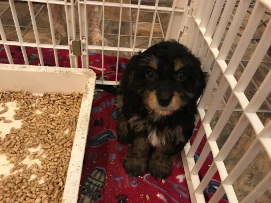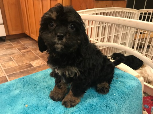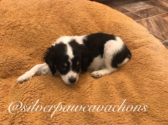 She is a calm and laid back puppy from what we can determine right now. This is an F1b litter so she is 1/4 Cavalier and 3/4 Bichon. Her parents are a Bichon mom and Cavachon dad.