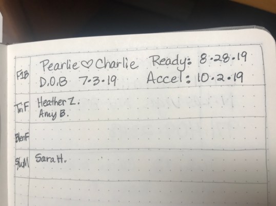 Here is the litter list so far. remember, your first consideration is timing so check those going home dates. Then color/gender. If the puppies work into all of those things, put your name on the list. When they are older, you can back out if personality doesn’t quite match up with what you are looking for. As each puppy has interested people, I will work with each group of names in waiting list order.