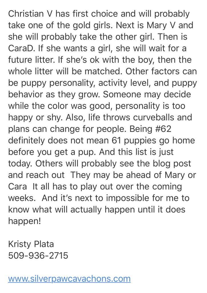 So, I wanted to share this to emphasize again that it’s very difficult for me to know how long things will take and whether there are puppies available because there are so many moving parts to all of this. If Cara wants a girl, but they’re both selected, then suddenly we’re talking to Joey at #55 yet he is the 4th person I’m talking to on the Litter List. And at this point, nobody should get their heart set on anything because it’s only been a few hours since I shared the first photos and likely there will be several others that will emerge from the woodwork of the waiting list.