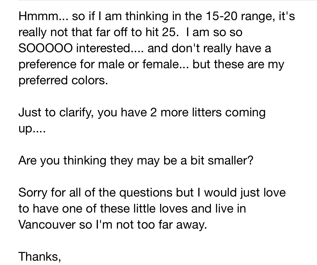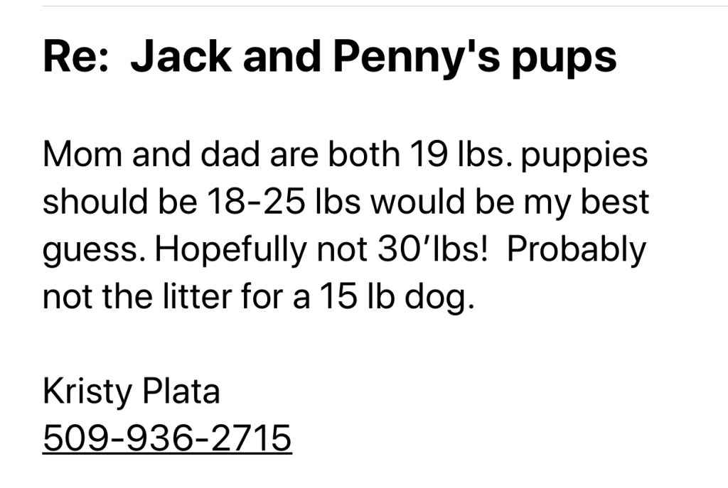 My email is buzzing now with response to the news of Penny’s litter. I’ve had some good email conversations and I want to share one that I think could be especially helpful for many others. Here are screen shots of our email thread.