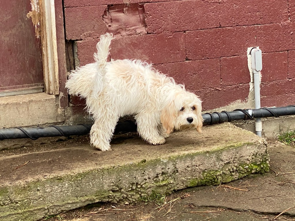 He is not consistent with going potty outside. He will go outside first thing in the morning sometimes. Inside, he will mainly go on the “pee pad” but he will also go on the kitchen floor.