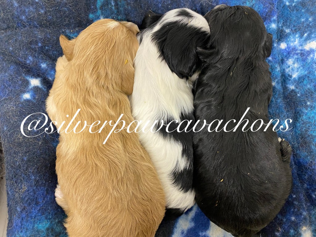 Mom and dad are Mimi (Bichon) & Duke (black/tan Cavalier). Puppies were born August 21st and we have three boys. This is a first generation litter, or F1.