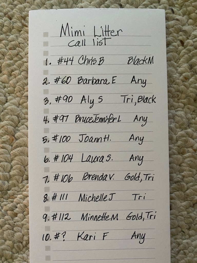 Chances are they will go to the first 3-5 families unless someone has had a big change of plans. I’d like to make calls tomorrow morning and do FaceTime with those that are able. I’ll start at 10am so please be available to receive my call. If tomorrow doesn’t work for you, please reach out today so we can make different plans.