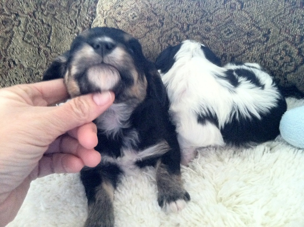 All of the black colors are rare and we don’t see them very often. If you are wanting a black or black and white puppy, this is your opportunity. These puppies should also be on the smaller side. I’m expecting them to be from 12-16lbs as adults.