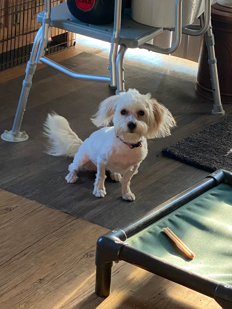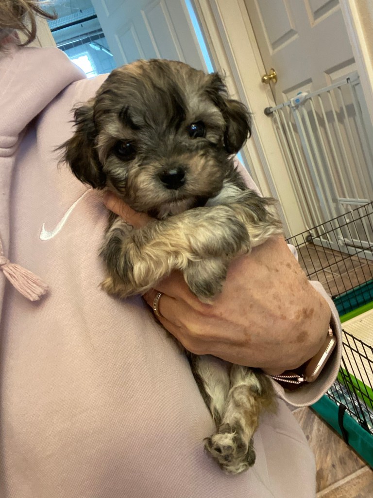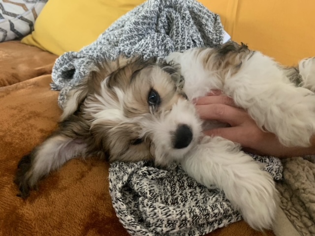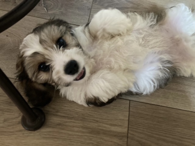 First, we have Buddy, the blenheim male Cavachon, accelerated puppy. He is taking daily walks on the leash and learning to use the doggie door and actively being crate trained. He is a lover boy and ready for his new home any day!