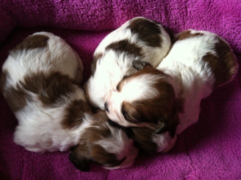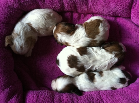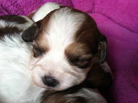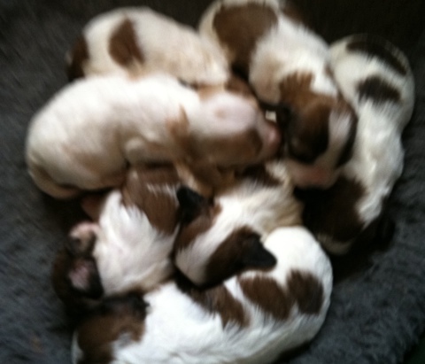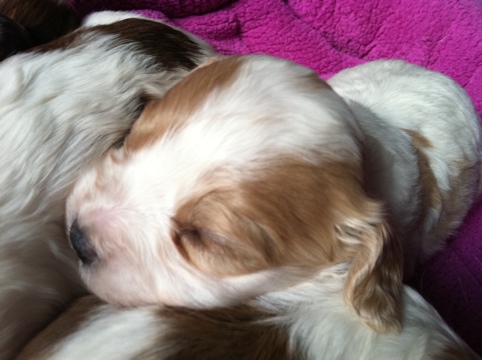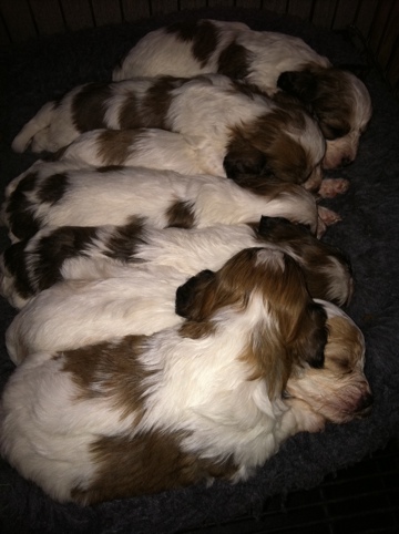 We are happy to announce the arrival of Princess’s Cavachon babies. There are 7 (yes, that’s SEVEN) thriving babies in this litter!