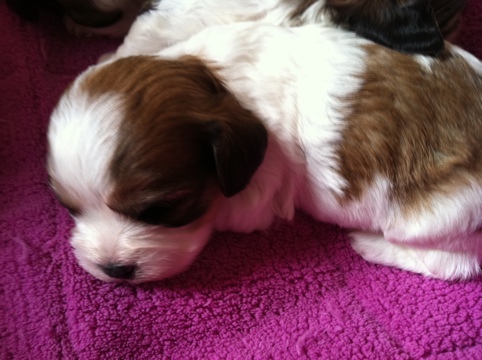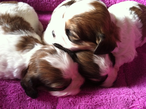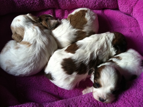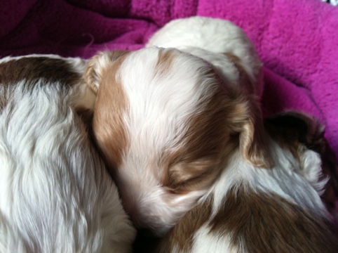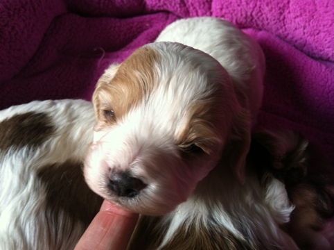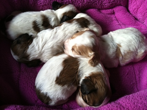 There are 3 sable/white females and 3 sable/white males, and one Blenheim male!